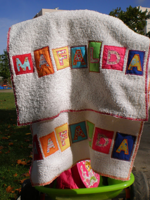 Este projecto foi mentalmente começado no dia 30 de Setembro, após a reunião de pais na escola da Mafalda, porque a propósito do inicio da Natação, foi pedido que as crianças levassem apenas uma toalha equivalente à toalha de rosto, para facilitar todo o processo de limpar, secar e vestir. Ora eu, já tinha as coisinhas prontas e a toalha era, claro está, grande. Ocorreu-me logo que poderia usar uma toalha dela, ainda daquelas de bebé, com carapuço e tudo, e reutiliza-la. Ainda para mais a toalha daria para fazer duas pequenas toalhas, o que mais jeito daria uma vez que a Natação é duas vezes por semana.